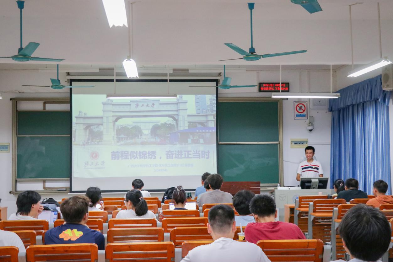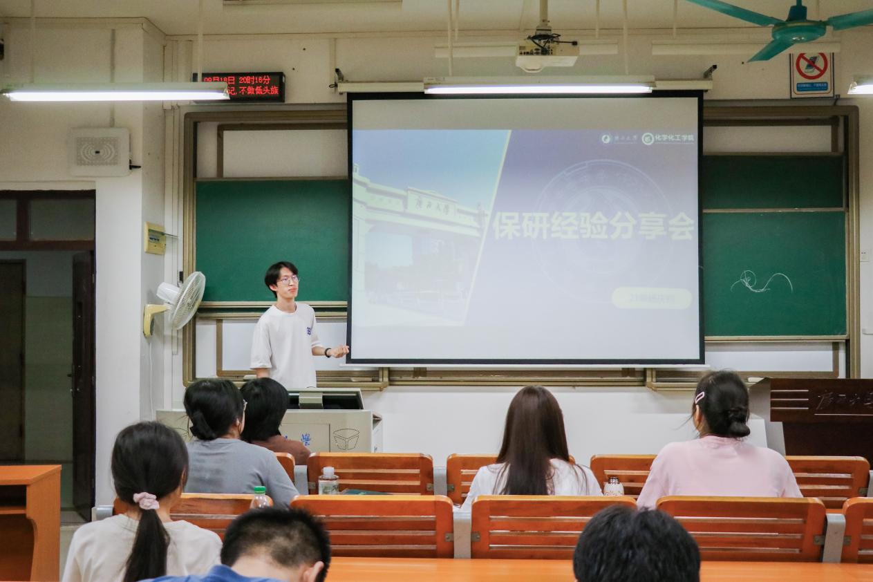 杨智楷曾荣获全国老员工化学实验创新设计二等奖、全国老员工职业规划大赛校选赛金奖等奖项,结合自身实际,他在会上向同学们分享了自己的保研故事,详细介绍了夏令营的相关事项,并展望个人规划,为新生有意向保研的同学加油打气。