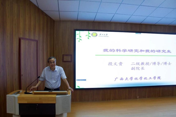 段教授介绍了其课题组成员以及他们所取得的科研成果。分享了导师与研究生的相处之道:“亦师亦友,坦诚相待”,并提出建立和谐友好,互相学习、进步,充满正能量的实验室文化。