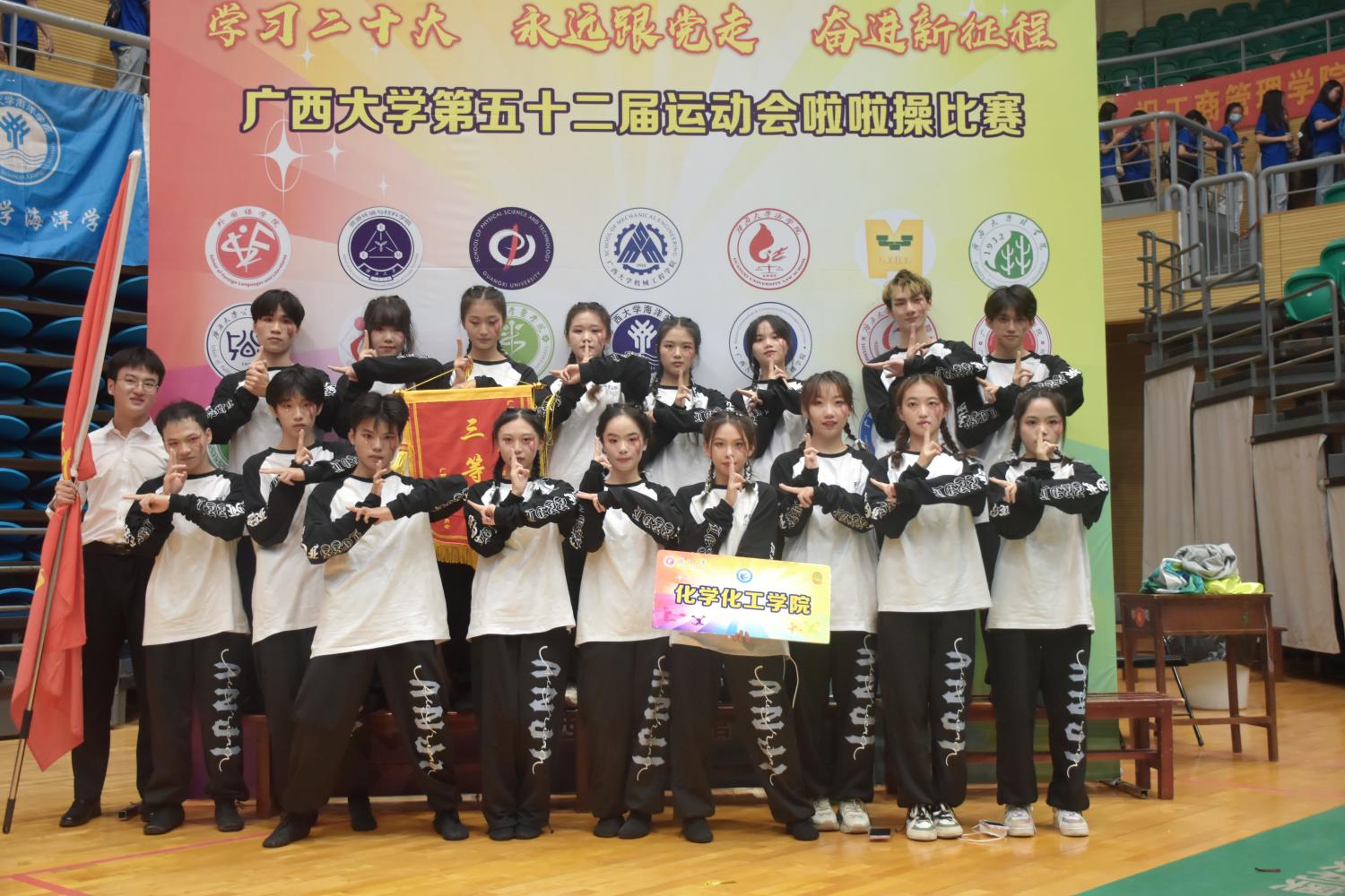 下午三点,比赛正式开始。各公司啦啦操代表们用一场激昂的开场舞拉开序幕,他们带着饱满的热情,以整齐而富有激情的舞步,赢得了观众的阵阵喝彩。化院啦啦操代表队统一着装,随着节拍,踏着动感的鼓点,弹跳着轻盈的脚步,身姿律动,动作整齐,展现了柔美与力量的碰撞,艺术与青春的邂逅,带给我们一场属于化院人青春的盛宴。而我们化院的拉拉队成员们,也在观众席大声呐喊着“化学化工,马到成功;化学化工,谁与争锋”的口号为我们的代表队成员们加油喝彩。