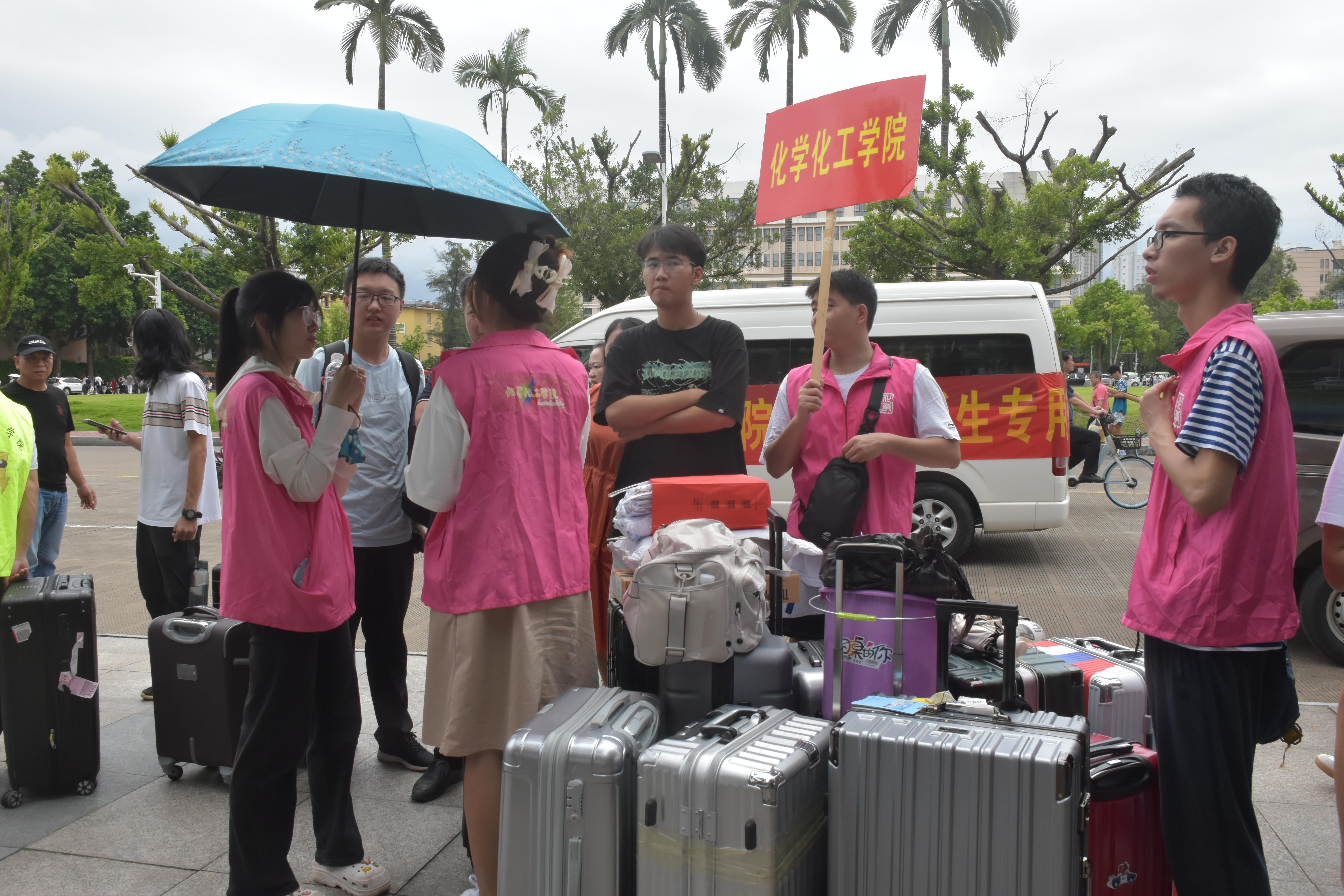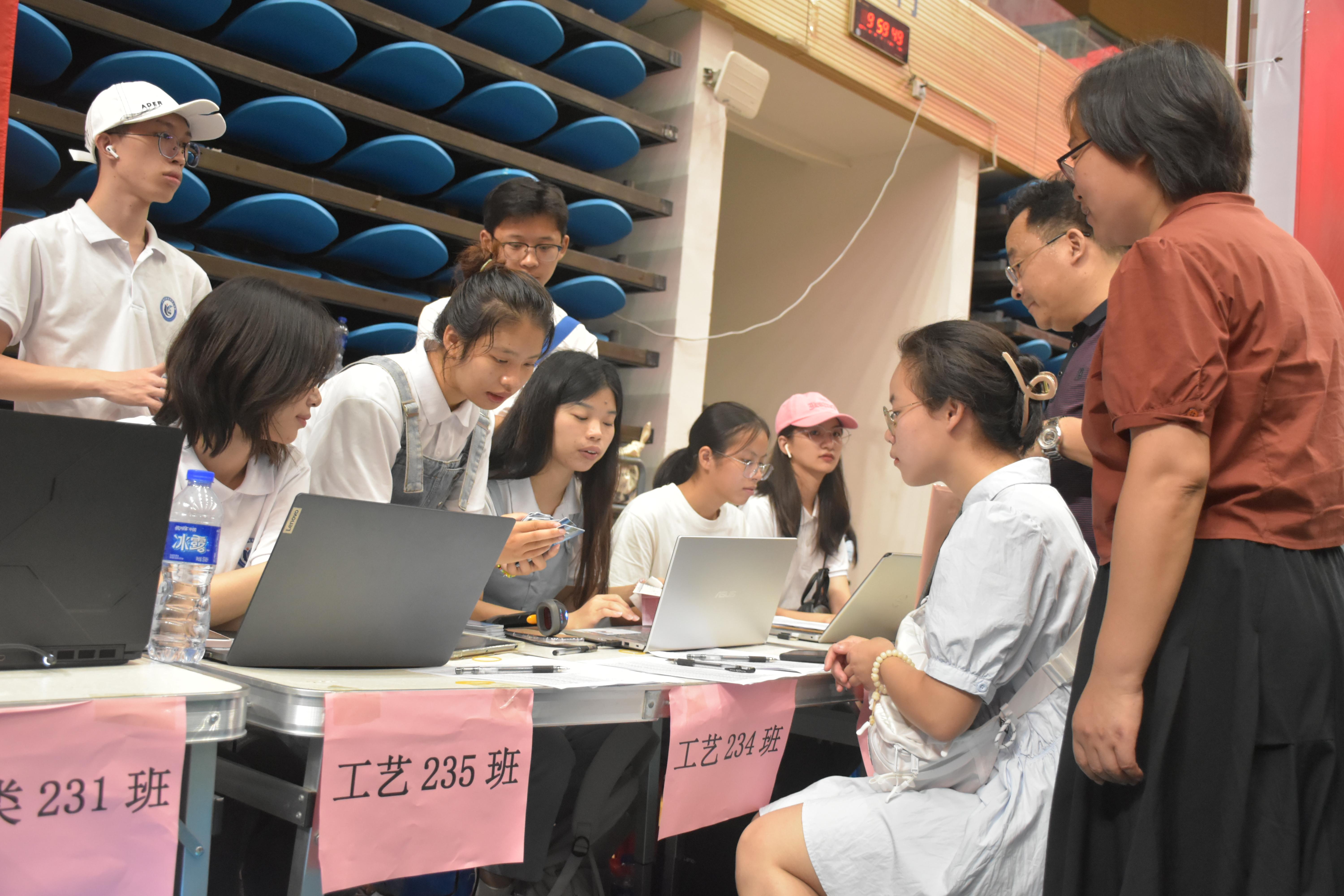 工作人员和志愿者们早早来到迎新工作点,布置场地,调试设备,做好准备工作。