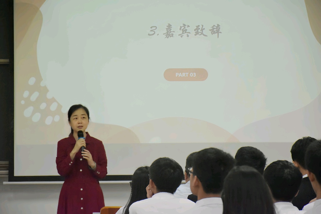 大会伊始,主持人梁健林、杨雅媛介绍了本次大会的流程和到场嘉宾,拉开了本次大会的序幕。首先,由张静老师作为嘉宾代表致辞。张老师对参会成员的到来表示热烈欢迎,并从以下方面勉励各位同学:一是员工会成员应该学会自己管理自己,二是员工会要做好老师的帮手,以及老师和同学之间的桥梁,三是希望各位新成员可以向优秀学长学姐学习如何协调好工作和学习的关系。