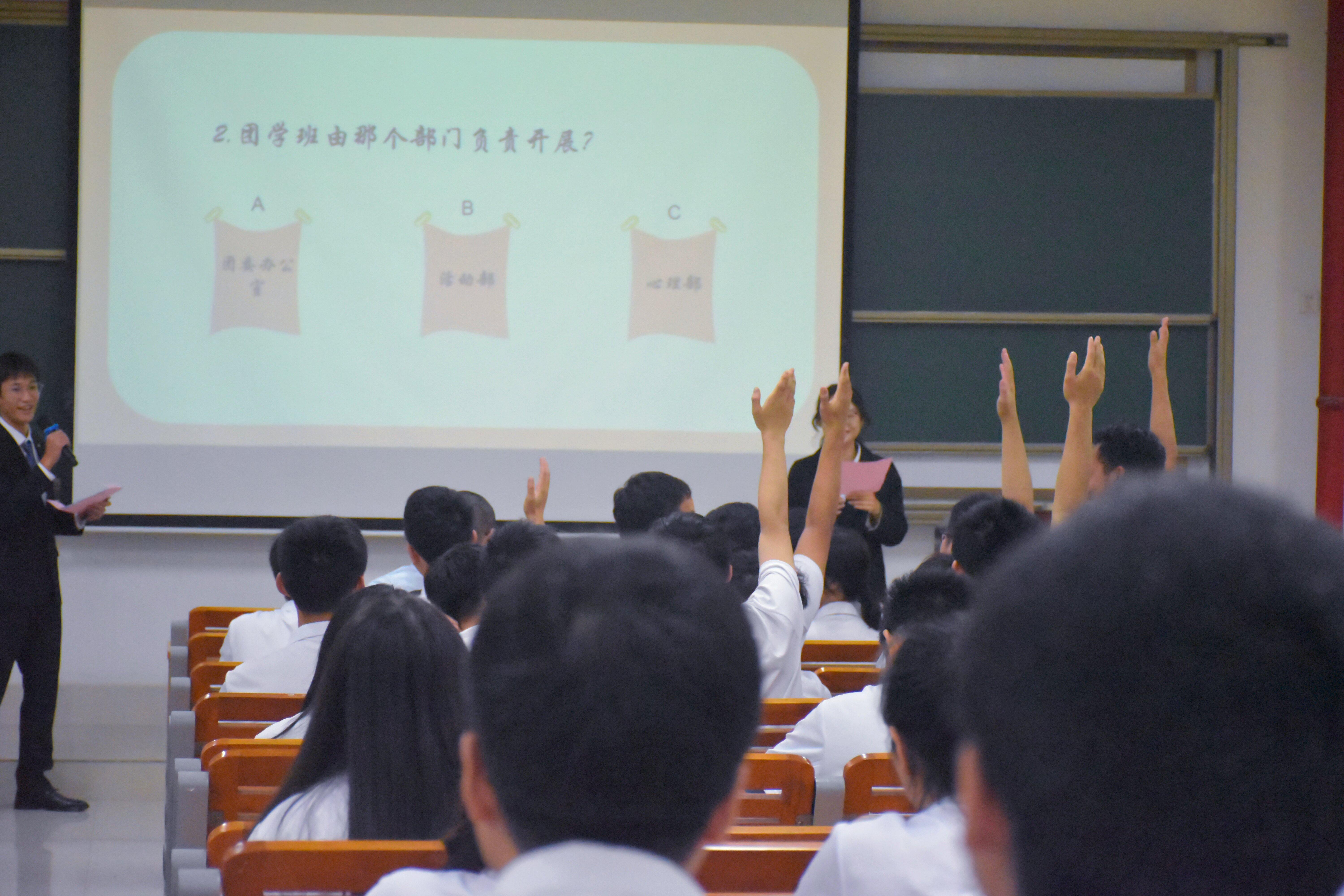 主持人先后介绍了主席团成员谢曼、苏霞以及秘书长欧芷彤。接着,团委员工会各部门以ppt的形式对部门进行一个简短的介绍,此环节主要讲述了各部门的工作与特点。台下同学认真聆听,在其后的有奖竞答环节中,同学们积极举手,踊跃回答,正确率高达100%。