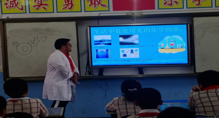 随着上课铃声打响,志愿者讲师夏振远、覃斯斯以“小朋友们看我这一身衣服像什么”拉进了与小朋友们的距离,小朋友们争相发言,课堂变得活跃。课堂的第一部分是化学小实验,讲师和小朋友们一起做实验。等待发生实验现象的过程中,讲师给小朋友们提出了问题,“小朋友们觉得‘化学’是什么呢?”小朋友们踊跃回答问题,讲师就着小朋友们的回答为他们解释了化学的概念,讲解了生活中随处可见的化学现象,让小朋友们对化学有一定基础的了解。