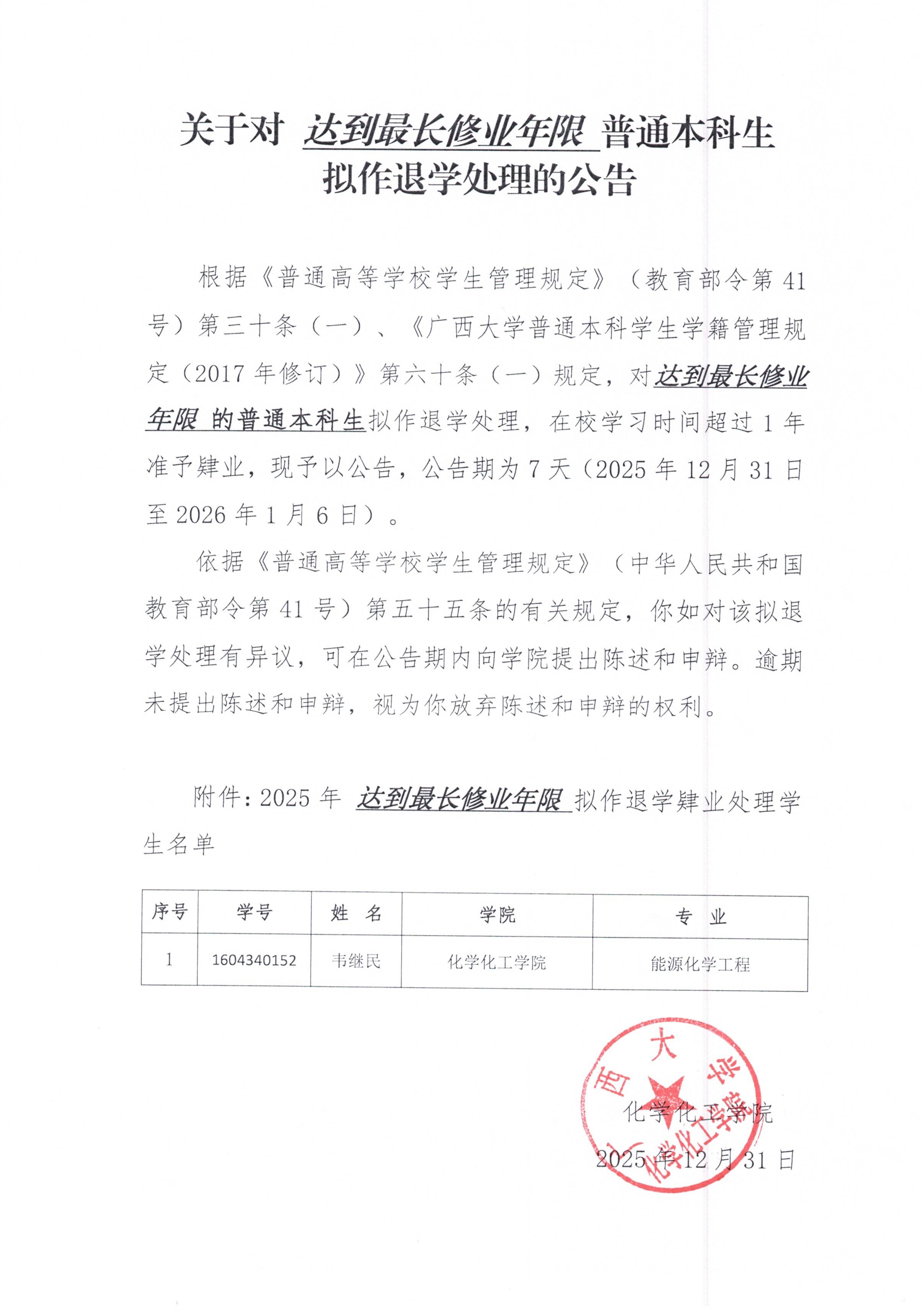 关于对达到最长修业年限普通本科生拟作退学处理的公告