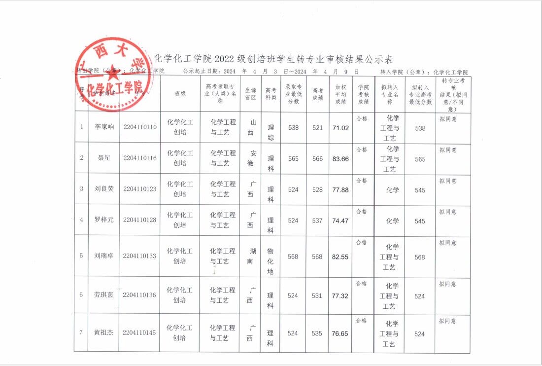 英国威廉集团官网2022级创培班员工转专业审核结果公示表
