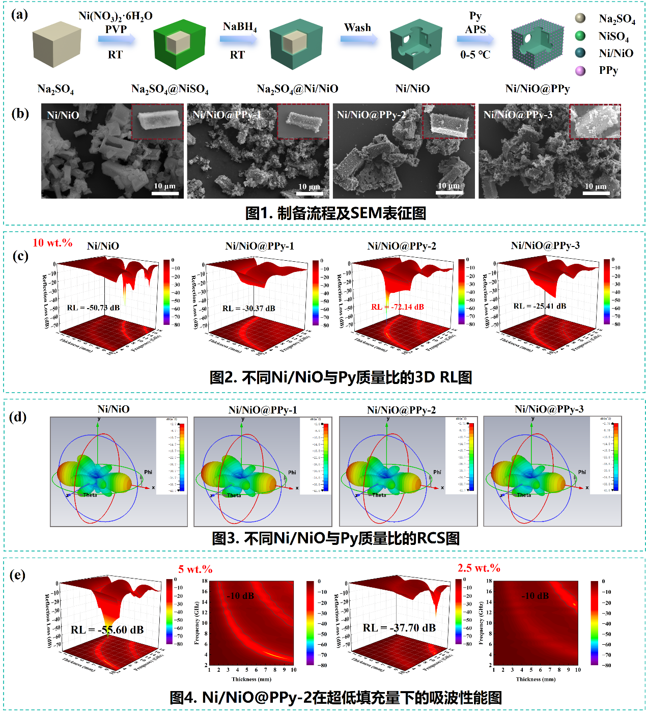微波吸收材料是一类能够有效吸收微波能量并将其转化为其他形式能量(如热能)的功能材料。它广泛应用于电磁防护、军事隐身以及通信设备抗干扰等领域。针对当前微波吸收材料面临的有效吸收带宽窄、填充含量高、密度大以及合成工艺复杂等诸多问题,公司结构热力学与微纳化工团队提出了一种可溶盐模板法结合原位聚合工艺制备中空Ni/NiO@PPy颗粒的策略,将复合颗粒填充于环氧树脂中,成功制得具有优异微波吸收性能的复合薄膜,其性能得益于多种损耗机制的协同作用。