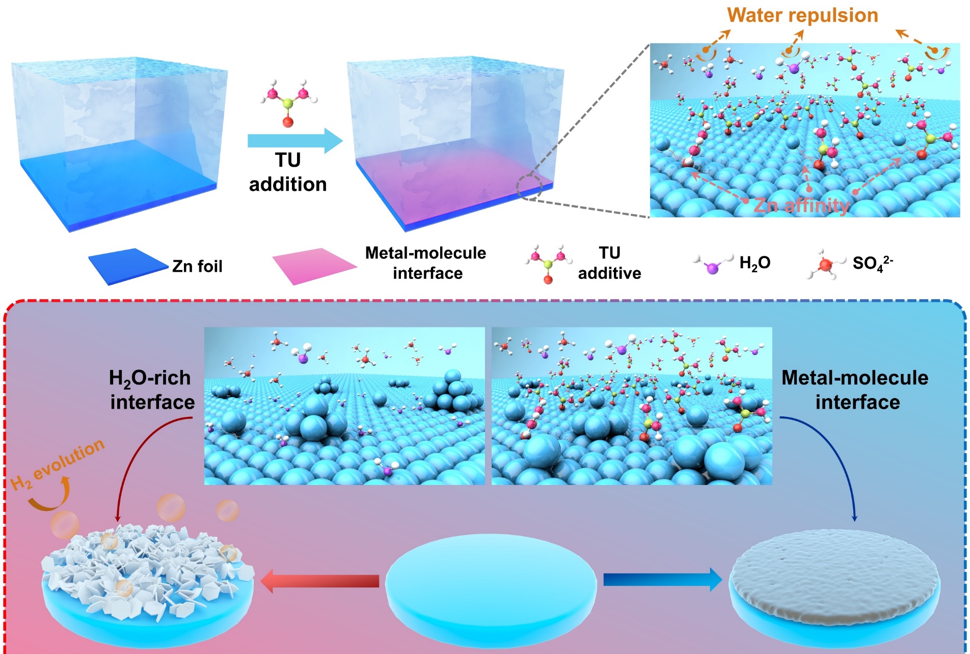 水系锌离子电池(AZIBs)凭借着绿色、安全的特性,被视为是下一代储能系统的有力竞争者。然而,金属锌负极与电解液间不稳定界面导致析氢、腐蚀和枝晶生长等副反应阻碍了其进一步发展。针对这一挑战,本工作提出了一种构建金属-分子界面工程策略来实现稳定的金属锌负极与电解液界面。通过在常规电解液中加入痕量的硫脲添加剂(5 mM),在金属锌负极表面构建了独特的金属-分子界面。其中,硫脲分子取代了双电层结构中吸附的水分子,抑制了与水相关的副反应;同时,金属-分子界面的高亲锌性提高了大量的锌离子吸附位点,降低了锌离子去溶剂化势垒,引导了锌离子均匀成核。