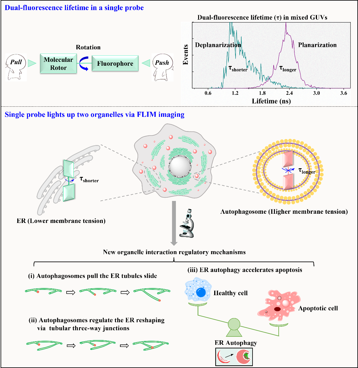 为了解决上述长期存在的重要科学问题,研究团队开发了一种独特的时间分辨策略,成功制备了具有双荧光寿命的小分子探针,利用单一荧光探针响应不同细胞器的膜张力来产生双荧光寿命信号,并利用荧光寿命成像(FLIM imaging)成功实现了在纳秒尺度上对细胞中内质网和自噬体相互作用的双荧光寿命成像。研究团队利用该双荧光寿命探针对内质网与自噬体的关系进行长时间观察,发现:(1)自噬小体驱动内质网小管尖端生长和滑动;(2)栓系在内质网小管尖端上的自噬小体形成一个以自噬小体为中心的三路连接结构。自噬小体在内质网生长尖端的伸长和内质网内局部结构域的重塑中起着重要作用。此外,研究团队还证明了内质网自噬是药物诱导细胞凋亡过程中的一种细胞损伤指标。通过顺铂刺激细胞会在早期阶段促进自噬体的形成,而在后期阶段加速内质网和自噬体的融合,表明密集和连续的自噬可能直接参与细胞凋亡。基于时间分辨策略的荧光寿命相关检测工具的开发提高了对细胞器相互作用调节机制的认识,将促进实现全面了解细胞器相互作用及神经退行性疾病的治疗。