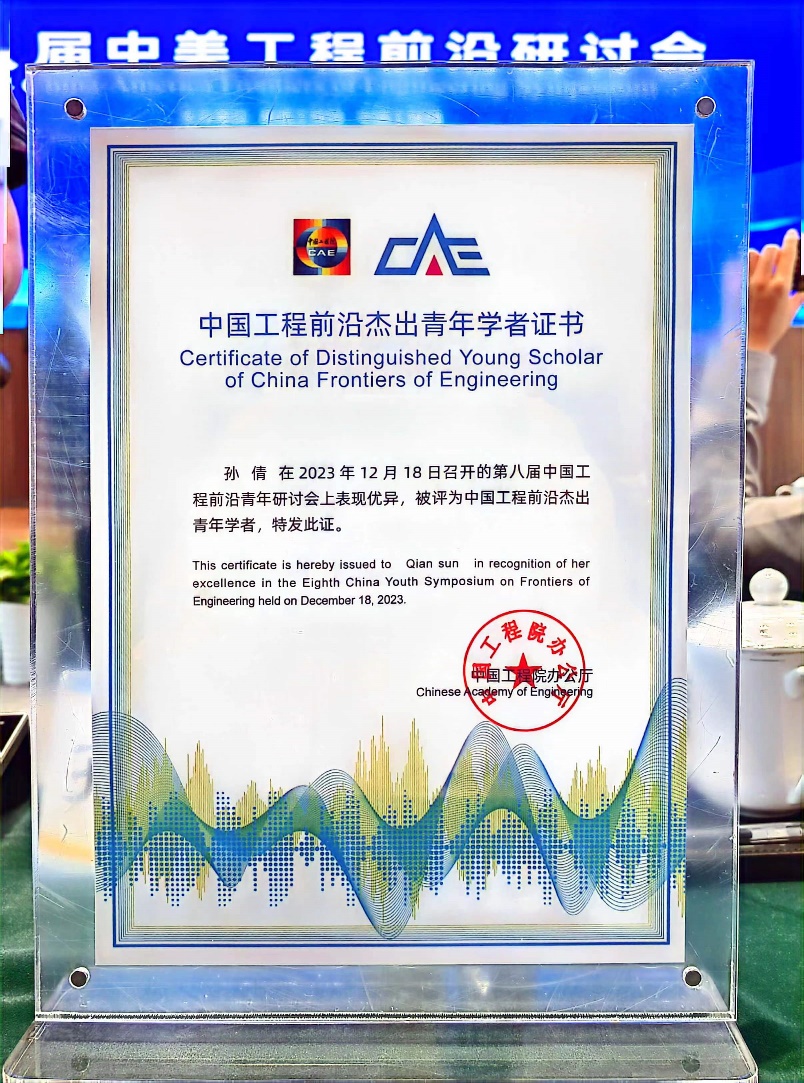 6月18日-20日,第八届中美工程前沿研讨会(简称CAFOE)在中国北京与美国加州尔湾同步连线举行。公司孙倩副教授受邀参加研讨会并荣获由中国工程院颁发的“中国工程前沿杰出青年学者”荣誉证书。