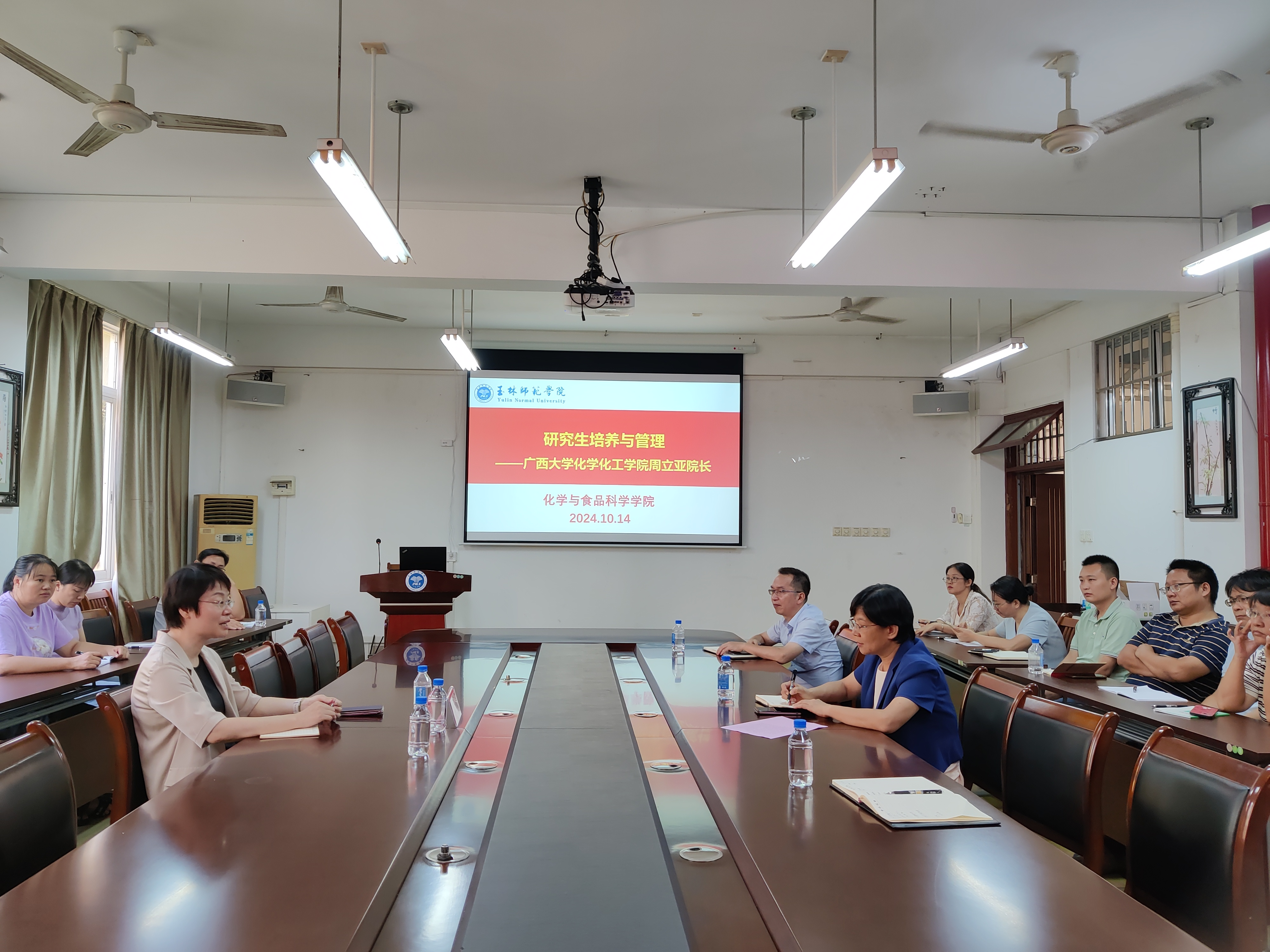 10月14日下午,应玉林师范公司化学与食品科学公司邀请,公司经理周立亚于东校区格物楼BA321会议室作报告并召开座谈会。会议由化学与食品科学公司经理谭明雄主持,化学与食品科学公司领导班子成员、各教研室主任及教师代表参加了会议。