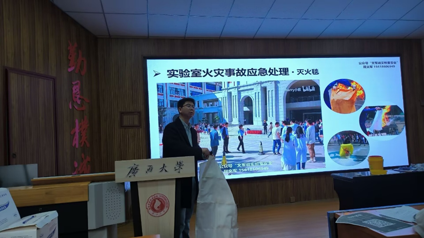 屈文军重点介绍了危险化学品的储存、安全使用,以及危化品一般事故的初期应急处置措施,并现场演示实验室防护用品的正确使用方法。同时引用事故案例,呼吁实验室人员高度重视实验室安全。
