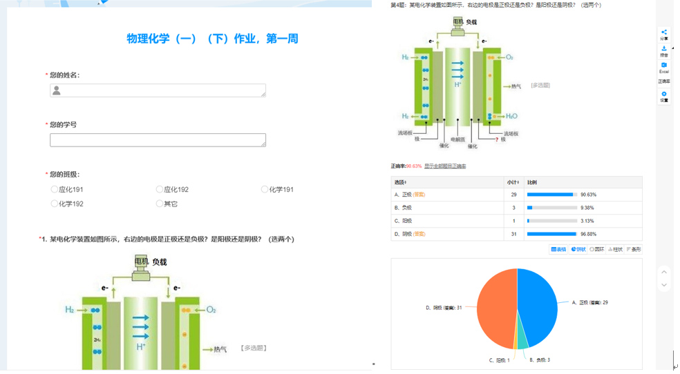 《物理化学》课程组的每一位教师在制订线上教学方案、用心备课的基础上,利用课程教学班QQ群、腾讯会议、腾讯课堂和雨课堂等在线教育平台,认真负责地完成每一堂课的授课任务。针对开学初员工尚未返校的特殊情况,教师们采用腾讯文档收集表、问卷星等方式进行作业的在线提交和批改,及时追踪和反馈员工学习情况,进行查漏补缺。同时,课程组教师之间也充分共享优质教学资源,分享教学经验和方法。