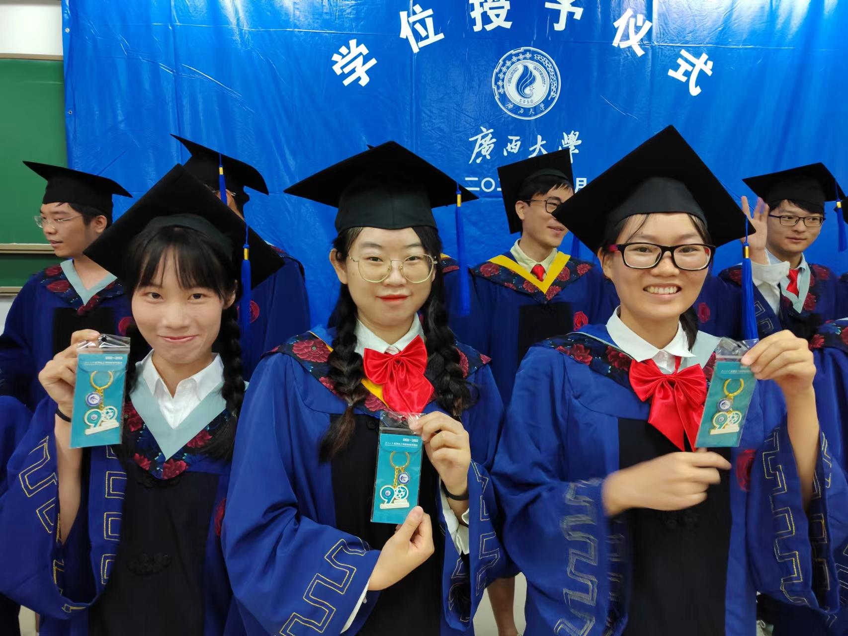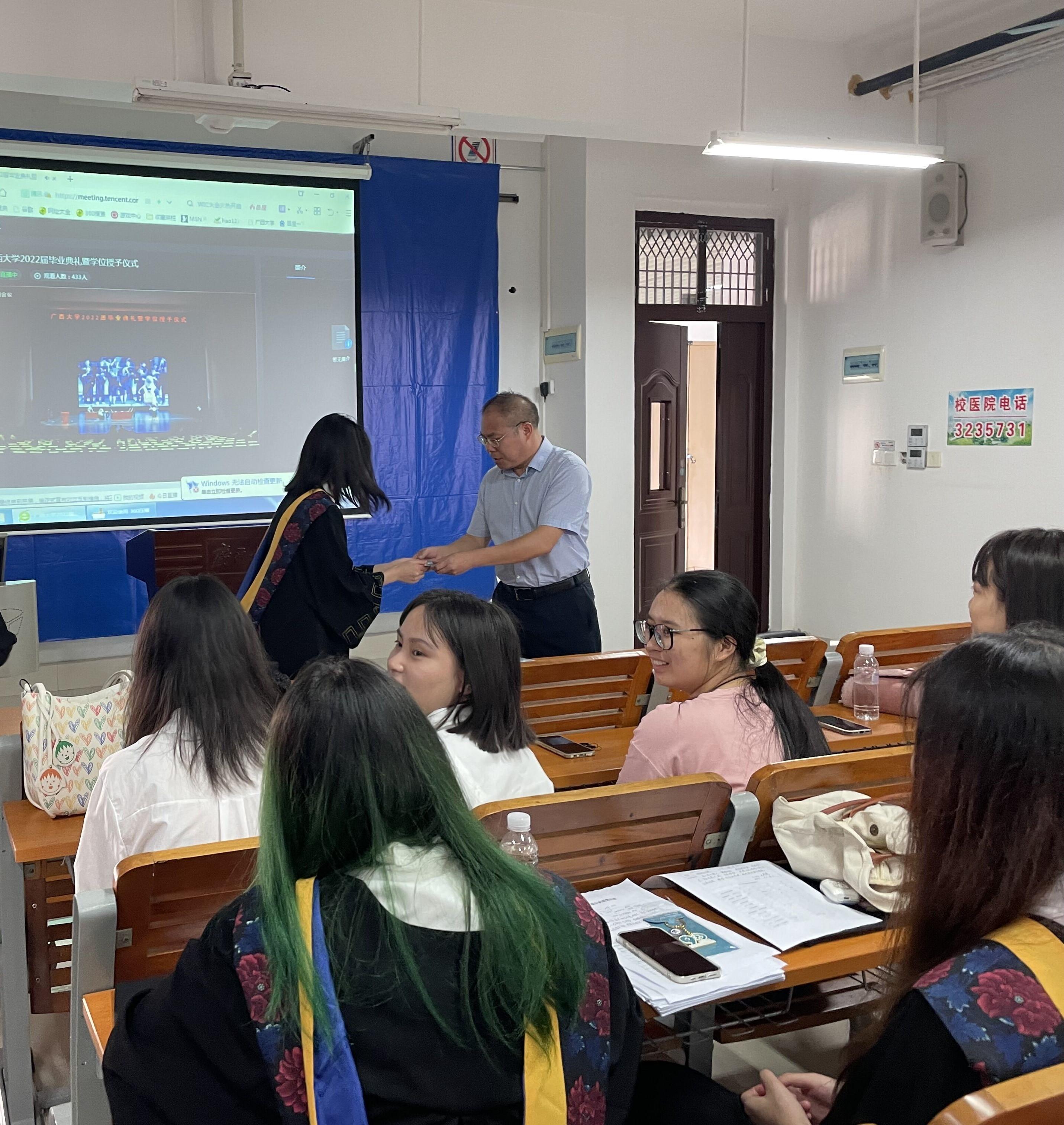 主会场典礼结束后,公司分会场进行学位授予仪式,公司党委周立亚书记依次为获得学位的毕业生颁授学位,拨穗、授学位、握手祝贺、合影留念……一本本证书,承载着每一位莘莘学子的努力与收获。
