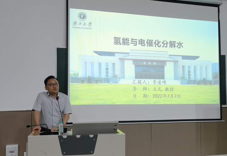 首场报告《氢能与电催化分解水》由化学工程与技术2019级博士研究生主讲,导师王凡教授主持,公司近百名师生聆听了报告。李凌峰同学给大家介绍了当前电催化分解水制氢及其催化剂研究进展,并展示了一种新颖的准平行纳米片阵列的生长机理及其催化性能的研究结果。会后同学们与李凌峰同学进行了深入的交流。